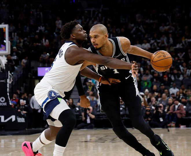 马刺主场迎战森林狼,马刺少了瓦塞尔,森林狼少了戈贝尔,森林狼大将里德打了5分钟伤退,首节比赛森林狼取得1分领先,第二节文班单节砍下20分,带领马刺单节赢了26分,半场战罢马刺领先25分,第三节森林狼强势反弹,单节追回13分,第四节爱德华兹暴走,单节砍下26分,森林狼一度反超比分,但功亏一篑,最终马刺以3分优势险胜森林狼。文班23中12(三分9中4)得到39分9板3助2帽,福克斯17中10得到25分3板12助,凯尔登14中8得到20分1板2助,森林狼方面爱德华兹33中19(三分16中9)得到55分4板3助,麦丹14中7得到23分5板5助、兰德尔13中4得到17分10板2断2帽。