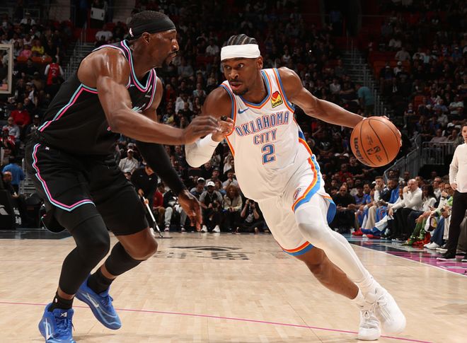 雷霆客场挑战热火,雷霆少了哈滕,热火少了希罗、米切尔、哈克斯,首节比赛雷霆赢了7分,第二节雷霆一度领先12分,随后热火开始追分,半场战罢分差追到5分,第三节雷霆大将杰伦因大腿酸痛不再出战,热火在三节战罢时追平分差,第四节双方交替领先,最终热火以2分优势击败雷霆,完成逆转。阿德巴约22中9(三分10中6)得到30分12板4助,鲍威尔15中5(三分12中5)得到19分4板4助2断,雷霆方面亚历山大19中12得到39分4板3助,切特12中6得到14分11板2助5帽。