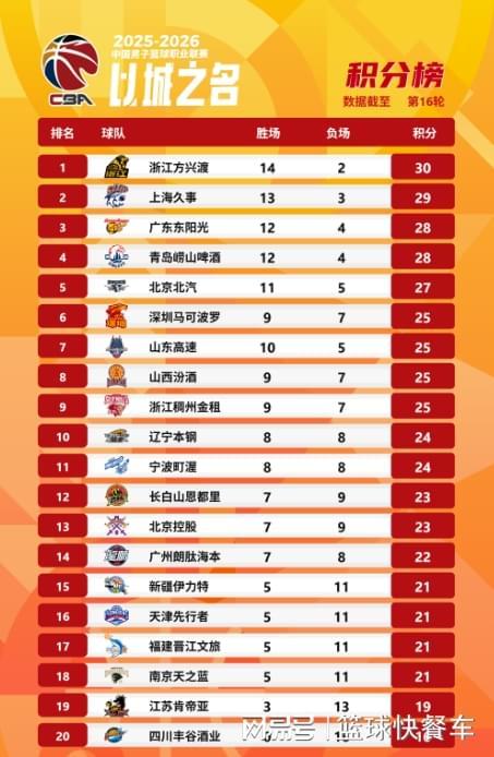CBA积分榜最新排名出炉!辽篮被双杀跌出前8:广东第3新疆第15