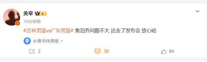 好消息是,焦泊乔的脚伤问题不大,赛后关辛第一时间发布报道,表示焦泊乔问题不大,还去了发布会。