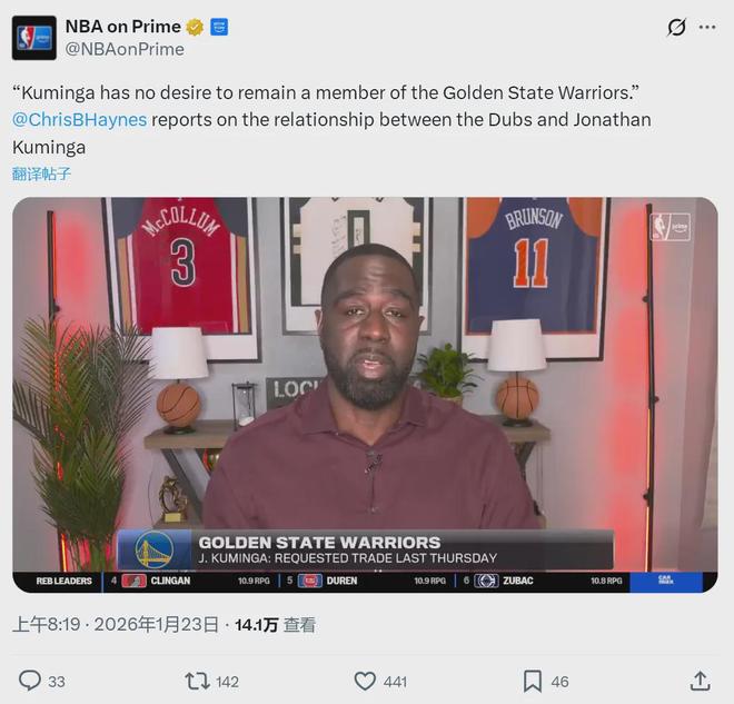 很多媒体人都表示,库明加可能打完了在勇士的最后一场比赛。今天赛前,NBA名记Chris Haynes爆料,库明加和科尔的关系已经不可修复,库明加仍然要求勇士在截止日前把自己交易送走。现在距离交易截止日,只剩下13天了!