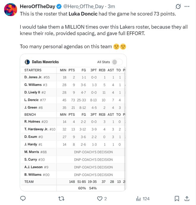 上半场打完东契奇拿到17分3篮板3助攻2抢断,詹黑媒体写道:快船这个阵容就是之前东契奇砍下73分的配置,但比起现在湖人的阵容我宁愿选择快船,因为他们至少清楚自己的角色能拉开空间并全力以赴,而现在的湖人队个人私心杂念太多。