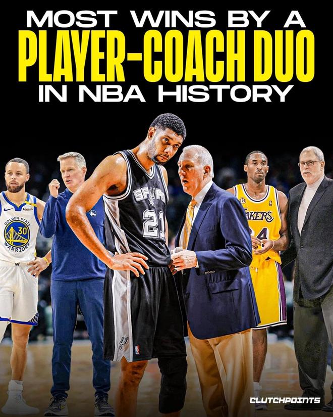 球员&教练搭档赢球场次排名:邓肯+波波1001场领衔,库里+科尔在列