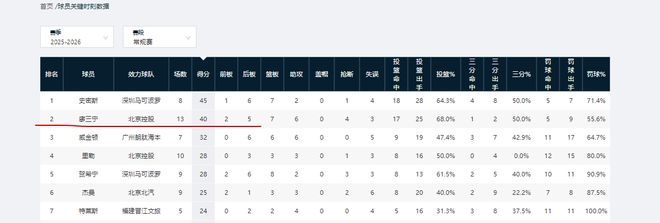截至本赛季第21轮,廖三宁已有13场比赛打出关键时刻数据,累计关键得分40分,关键助攻6次,关键时刻抢断4次,这三场数据分别力压众多外援高居联盟第二、第四、第一。