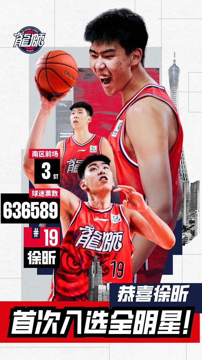 CBA官方公布了今年全明星赛的阵容名单,广州男篮的国产内线球员徐昕入围,球队发文进行祝贺。在这次票选中,徐昕总共获得了636589票,位列南区前场第3名!这是徐昕职业生涯首次入选全明星,在今年的全明星赛事上,他将以轮换球员的身份代表南区明星队出场。