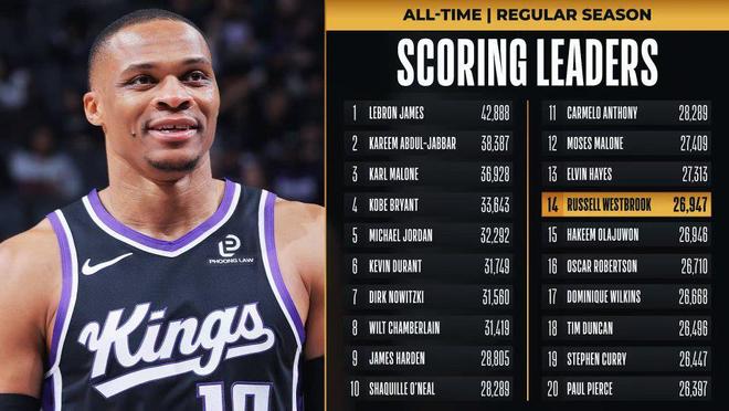 威少常规赛总得分超越火箭名宿奥拉朱旺,升至NBA历史总得分榜第14位。