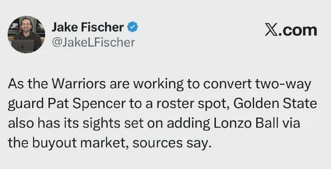 名记Fischer透露:勇士计划在买断市场里面签下“球哥”朗佐-鲍尔......