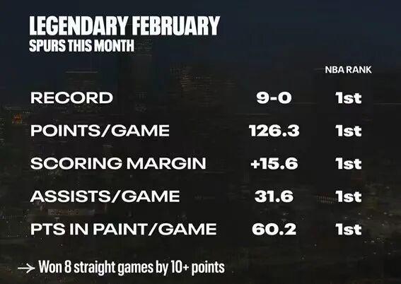 马刺当前势头极佳,今年二月份至今未尝败绩,9胜0负,并且场均得分(126.3)、场均净胜分(15.6)、场均助攻数(31.6)、场均禁区得分(60.2)均高居联盟榜首,对于他们而言一切皆有可能。