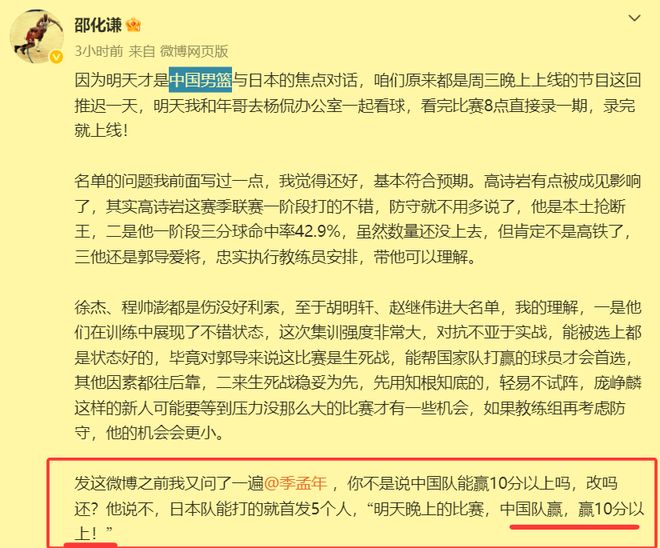 但是,篮球专业人士邵化谦和季孟年,却都非常看好中国男篮能够在客场赢下比赛。并且他俩认为,中国男篮不仅要赢不可一世的日本男篮,而且还要赢得比较漂亮,至少能赢对手10分以上。