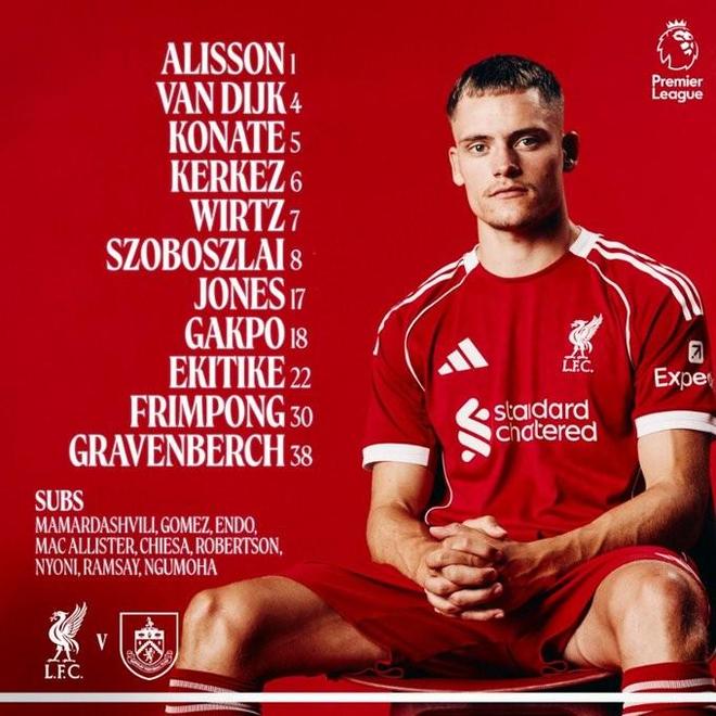 利物浦vs伯恩利:埃基蒂克、维尔茨首发,麦卡利斯特替补