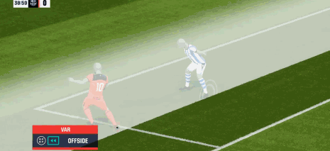 半场补时最后时刻,亚马尔禁区内倒地,主裁听取VAR后判罚越位在先,取消点球。