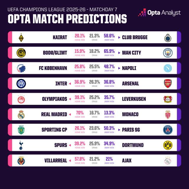 考虑到诸多因素,Opta的超级计算机为这场重头戏推演出了“势均力敌”的结果。国米主场赢球的概率达到36.9%,阿森纳则是36.8%,余下26.3%的模拟数据是平局。这里补充一句,联赛阶段还有两轮,枪手本轮的客场对手强,下轮要主场迎战的却是鱼腩——哈萨克斯坦球队阿拉木图凯拉特前6轮只拿到1分,打进4球但被破门15次。