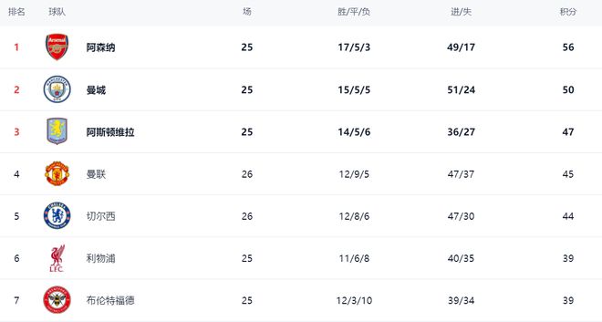 在积分榜上,阿森纳以56分高居榜首。曼城紧随其后,拿到50分,比阿森纳少6分,依然有冲击冠军的希望。阿斯顿维拉只拿到47分,排名第3,冲击冠军的机会很小。曼联战平,保住了第4的位置,总积分是45分。同样战平的切尔西以44分排名第5。利物浦只拿到39分,排名第6,争四前景比较悲观。布伦特福德也是39分,排名第7。纽卡斯尔联36分,排名第10。输球的热刺则掉到了第16名,只拿到29个积分。