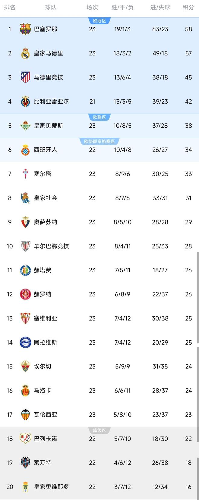 随着皇马2-0紧追巴萨,马竞0-1翻车,西甲积分榜出炉:前二差1分