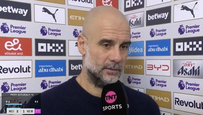 英超第27轮,曼城主场2-1击败纽卡,赛后,曼城主帅瓜迪奥拉接受了TNT体育的采访。