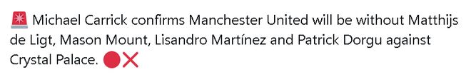 曼联主帅卡里克透露,本周末与水晶宫的英超比赛中,受伤的四名球员梅森·芒特、利桑德罗·马丁内斯、德里赫特和帕特里克·多古暂时无一可以复出。其中,6000万英镑中场芒特已经恢复训练,有望在下一轮做客纽卡斯尔联时回归。姆贝莫虽然对埃弗顿时因伤被换下,但无碍继续参赛。
